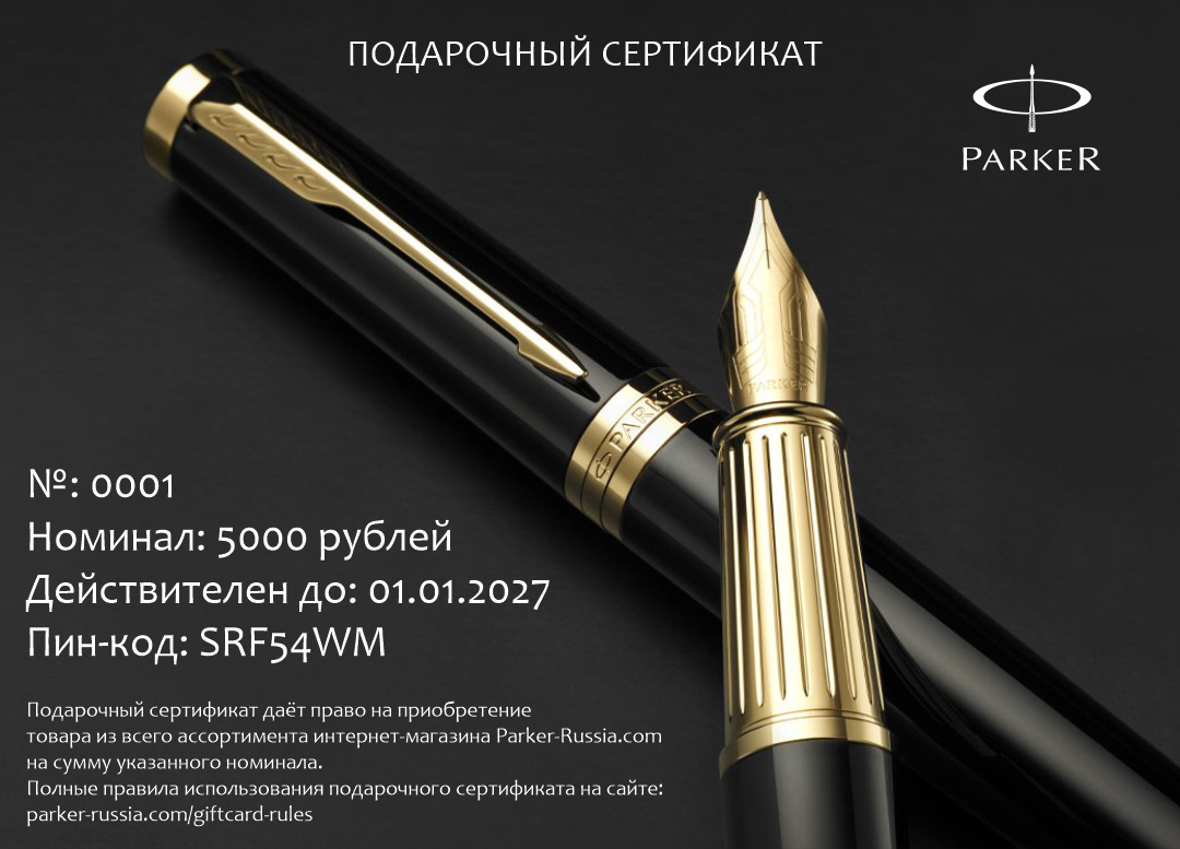Электронный сертификат гибкого номинала от официального дилера Parker в Обнинске. Вы можете дополнительно заказать гравировку, которая подчеркнет Вашу оригинальность и придаст памятность статусному подарку. Все ручки Паркер поставляются в фирменном футляре.